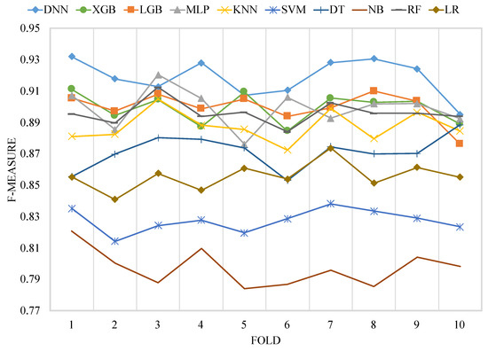 In prediction tasks, the F-score is a widely used evaluation metric that leads to a single score accounting for both precision and recall concerns. Table 3 illustrates the performance comparison results. The obtained metrics reported in this table are the average values over all folds. It can be seen that DNN reveals the best values across all measures compared to other classifiers. An average F-measure of 0.9187 is scored by DNN, followed by 0.8998 is reached by LGB. Tree ensemble methods stand in second place with nearly equal figures. MLP shows a higher precision of 0.9025 than tree ensemble algorithms but due to the increased false negative rate in MLP, the recall and F-measure values are alleviated. Despite achieving a high precision of 0.8736, NB performs poorly in other evaluation metrics. The main reason for the poor performance of the Bayesian classifier is the unequal class distribution and the insufficient number of fault cases in our experimental data. Figure 5 shows the F-measure values obtained by each model at each fold of cross-validation. Using the F-score metric, it can be verified that the selected DNN model outperforms the lowest average score of the naïve Bayes classifier by 15.22%.