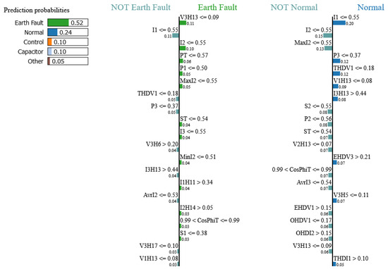 The explanations provided by LIME and SHAP will enable users to understand and interpret the predictions generated by the model. We employ both techniques to explain the predictions of our model. A randomly chosen earth fault sample with a probability of 52% is used for further explanation. For faster and improved performance, the DeepSHAP [31] approach is used for our model to compute SHAP values. As shown in Figure 6 and Figure 7, both algorithms are configured to show only the top 20 most important features. The features are sorted in descending order from top to bottom. In Figure 7, the top features are listed on the vertical axis while the horizontal axis indicates SHAP values. There are 11 common features identified by both methods. In both figures, it can be realized that the phase III voltage harmonic of order 13 (V3H13) has the most significant impact on the predicted result. On the left side of the LIME plot, prediction probabilities of the different faults have been presented. There is a 52% probability of an earth fault while having a 24% chance of being in the normal state.