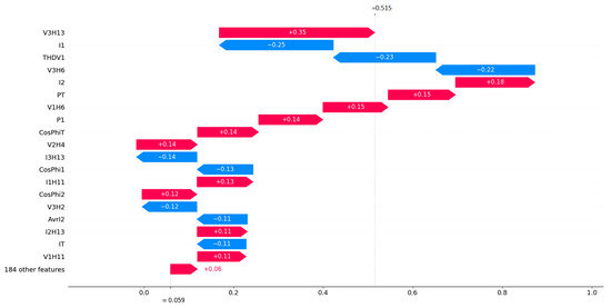 Therefore, the features with positive contributions are presented in green and placed on the right side of the vertical bar. On the contrary, the features with a negative effect on the decision are positioned on the left side of the bar. Likewise, in the SHAP plot, the red bars indicate factors with positive SHAP values, such as V3H13, I2, PT, etc. and negative ones are in blue, like I1 and THDV1, etc. This graph demonstrates how to transition from the mean of all predictions, E[f(x)], to the predicted probability.