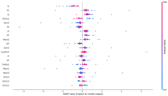 Furthermore, we can visualize SHAP values for a set of correct predictions of the same class to have a global explanation. A global summary plot is shown in Figure 8, combining feature importance with feature effects. The vertical axis illustrates the prominent features, whereas the horizontal axis corresponds to SHAP values. Each row represents a feature and each point illustrates a sample. The red dots show high feature values while the blue dots show low values. The features are ordered according to their importance. Some features have distinguishable red and blue dots distributed along the x-axis so that we can easily infer their impact. Apparently, the high values of the total power factor (CosPhiT) and 13th harmonic of phase I voltage (V1H13) together with low values of 13th harmonic of phase III voltage (V3H13), and current (I3H13) and 11th harmonic of phase I voltage (V1H11) elevate SHAP values and the probability of earth fault. Moreover, by comparing this plot and LIME local explanation for one of these samples in Figure 6, we can observe similar parameters like V3H13, I3H13, CosPhiT, and V1H13 contributing in the earth fault decision.