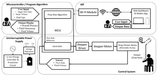 - Sanjay, S.B.; Harish, B.; Karthikeyan, K.; Arunachalam, G.M.; Vaishnavi, K.; Anush, P.; Mahalakshmi, R. IoT Based Smart IV Drip Stand. In Proceedings of the 2021 International Conference on Advancements in Electrical, Electronics, Communication, Computing and Automation (ICAECA), Coimbatore, India, 8–9 October 2021; pp. 1–5. [Google Scholar] [CrossRef]