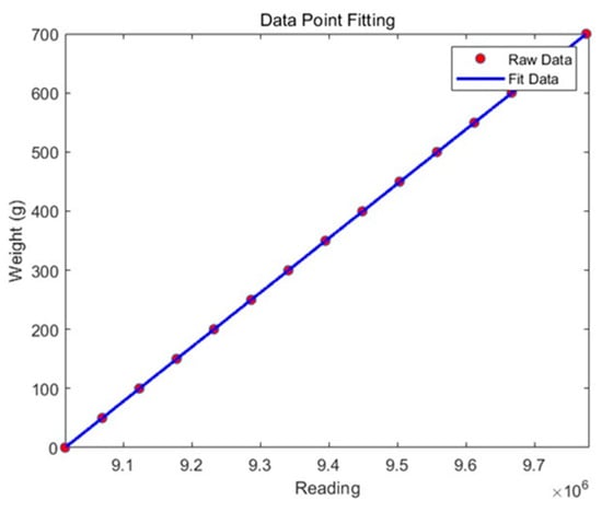 The sensor employs a 1 kg full-scale single-point parallel beam load cell to achieve lower costs. The load cell has four wires leading out: two connect to the excitation source, and two connect to the positive and negative input of the ADC preamplifier. Two parallel Acrylic plastic plates are fixed on both sides of the load cell as the base and upper platform. The HX711 24-bit ADC module is used to read load data and communicate with the microcontroller. This ADC includes a ±1.25 V built-in reference voltage, a built-in regulated source as the excitation voltage for the strain gauges and amplifier with three adjustable gains of 32, 64, and 128 times for amplifying the output voltage of the load cell. It also allows setting two sampling rates of 10 Hz and 80 Hz. Due to its features and low cost, it is commonly used as the ADC for weight sensors. The above materials form a weighing platform. Several weights, calibrated for actual weight using a milligram scale, are used as references to calibrate the load cell. When testing the weighing platform, it must first be calibrated. The HX711 module is powered by a 5 V adjustable power supply, with its gain set to 128 and sampling rate set to 10, giving an average reading of ten measurements per second. Since the module does not have an anti-aliasing filter on board, two of the 100 μF filter capacitors are added to the positive and negative analog input of HX711 module. Considering the 1000 Ω output resistor of load cell, the RC filter cut-off frequency is approximately 3.15 Hz. The calibration weights range between 0–700 g in 50 g steps. The actual weight of the weights is read by a milligram scale and placed at the center of the load cell. The average of ten sampling values is printed via the serial port, and then an average of these ten values is taken to obtain the calibration raw data. The load cell is a linear sensor, and, excluding the zero point, the data are fitted with a linear equation to minimize the mean square error, obtaining a scale factor of 1086.65. Taking the zero-point reading as the offset, the calibration curve and data points are shown in Figure 2.