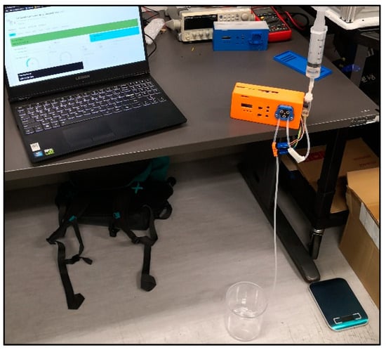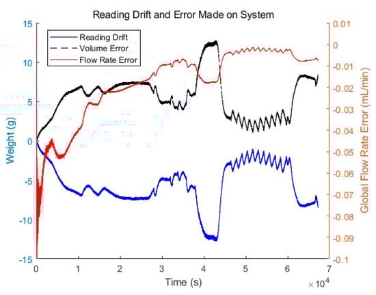 Figure 15 displays the flow rate of the saline solution read using the filtered data from the weighing platform. The flow rate is generated by a peristaltic pump with a resolution of 0.12 μL/min and an accuracy of 0.5%. The flow rate is set to 0.1 mL/min, with a total volume of 50 mL.