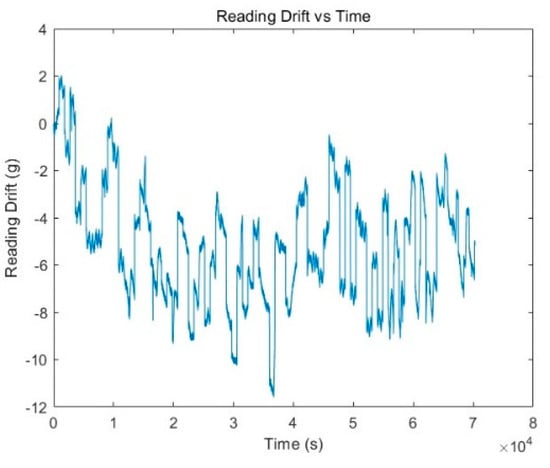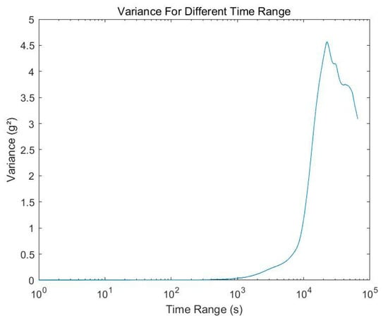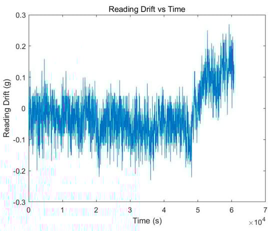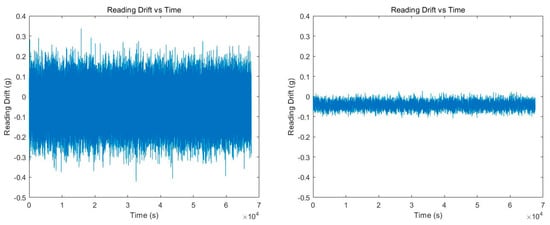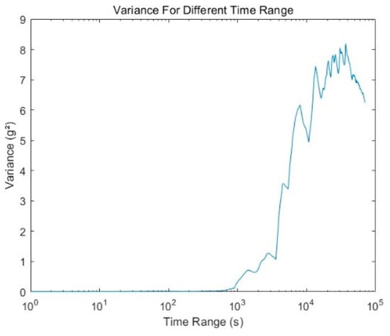 In addition to the calibration method mentioned above, there was an attempt to introduce a calibration method for the scale factor to eliminate the impact such as temperature on the scale factor. However, the sensor’s repeatability error is too large, around ±0.15 g. This far exceeds the scale factor shift caused by every 10 °C deviation noted in the data sheet, suggesting that, with the calibration method for scaling factors, additional uncertainty was introduced, higher than the temperature drift error being calibrated. For a self-calibration method for the scale factors introduced, drift vs. time is shown in Figure 7, and the corresponding variance vs. time is shown in Figure 8. On the same timescale, the variance is even worse than the variance is without self-calibration.