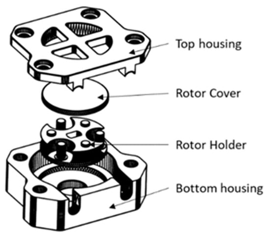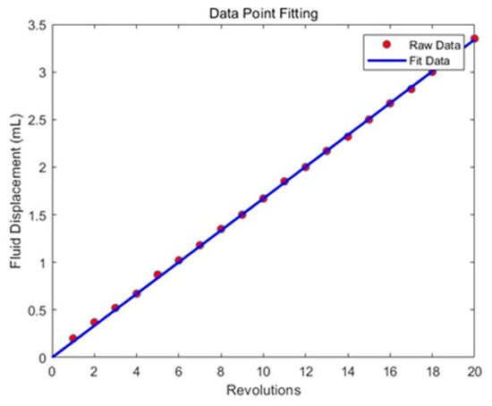 The type of peristaltic pump design that will be considered in this project is the roller-type peristaltic pump. It generates flow by deforming the infusion pipe and forces the fluid to flow in one direction. This pump design isolates the fluid from the mechanical parts of the pump which prevents any contamination to the flowing fluid in the pipe. The one requirement for this roller-type peristaltic pump is that the infusion pipe material must be flexible or elastomeric. The conceptual design of this stage is compatible with an infusion pipe that is 4.5 mm in diameter. The 3D printable parts for the pump are illustrated in Figure 9. Figure 10 listed the measurements of the fluid displacement vs. revolutions of the peristaltic pump and the fitted data, while the fluid displacement per revolution is set to 0.167 mL/revolution.