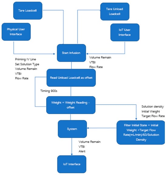 Both load cells are working while the system power is turned on. Some parameters can be set through both the physical user interface and the IoT user interface. But some critical operations, like priming the IV line and setting the solution type, must be carried out through the physical user interface to avoid human errors. Once all the required parameters are set, the infusion can start. When the infusion begins, the MCU first read the unload load cell to determine the offset. All weight readings subtract this offset to obtain the calibrated reading. The offset updates every 900 s to reduce the task resource consumption. Since the sensor reads weight, not volume, the readings also need to be divided by the solution density to convert it to the volume. The initial state of the IIR filter is based on the initial weight reading plus the weight of the fluid expected to flow out in one second at the set flow rate, ensuring that the flow rate input to the PI controller is close to the correct rate initially. The calculated remaining fluid volume, the VTBI, and any alerts in case of abnormal conditions are displayed in real time on the IoT user interface.