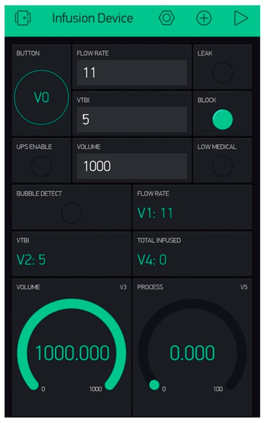 The IoT functionality is achieved through the Blynk IoT []. Blynk is designed with multiple layers of data security to ensure user safety and device control integrity. The application encrypts every message, providing a secure transmission, though some hardware without TLS support may not benefit from this feature. Additionally, it uses granular permission to manage who can view devices and their data []. As shown in Figure 12, users can set the total injection volume and flow rate through the interface and monitor the volume remaining and progress. However, the solution type must be entered from the device’s physical operation panel with medical personnel present for verification.