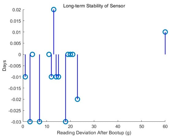 The long-term stability and stability under multiple times of power on–off are crucial for system performance. Figure 14 illustrates the long-term stability of the weighing sensor with the filter configured. As the filter requires time to set, the readings are taken 5 min after bootup. The error in readings after bootup remains within the sensor’s self-drift error, indicating that the sensor’s performance has virtually not changed over a 60-day period.