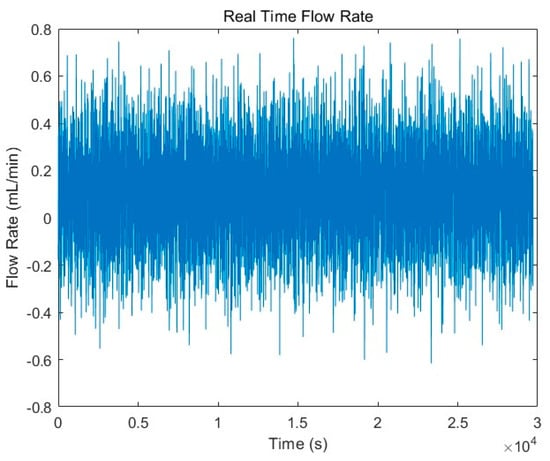 Significant noise level increases are observed in practical applications, possibly due to the pump’s vibrations coupling to the sensor. The noise in the flow rate reading is very high, making it impossible to correctly read the real-time flow rate. According to the closed-loop system modeling, the simulated cumulative error (the global flow rate error) in the PI control is 1.5%, which is within an acceptable range. However, without the self-calibration algorithm, the static data collected and filtered through the same parameter filter result in a simulated PI controller cumulative error of 15.9%. This shows that the calibration method significantly improves the global flow rate error in closed-loop control using the weight sensor to read flow rates, but whether local flow rate errors will pose problems in practical applications requires further study. When the flow rate is set to 0.5 mL/min, the read flow rate is as shown in Figure 16. The real-time flow display still lacks reference values, with a simulated PI controller cumulative error of 0.6%.