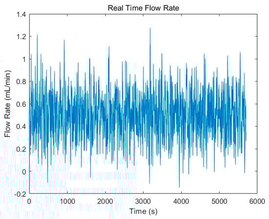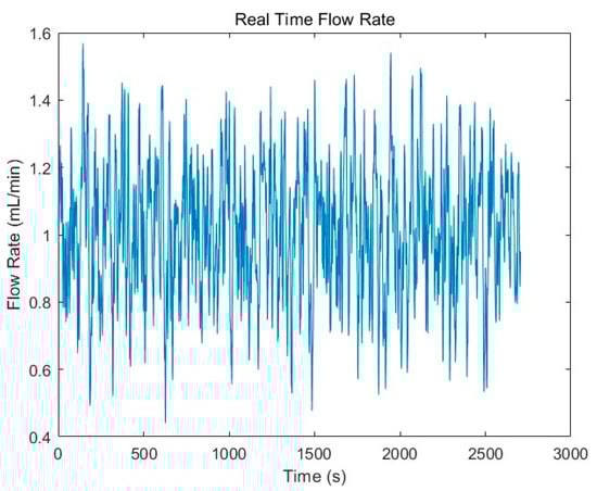 When the flow rate is set to 1 mL/min, the read flow rate is as shown in Figure 17. The real-time flow has some reference values, but, at times, the error is still very large. The simulated PI controller cumulative error is 1.3%. The error rate has significantly increased compared to 0.5 mL/min, speculated to be due to the greater vibration disturbances caused by the increased speed of the peristaltic pump.