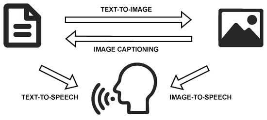 Diagram showing relations between tasks of: image captioning, text-to-speech, image-to-speech, and text-to-image.