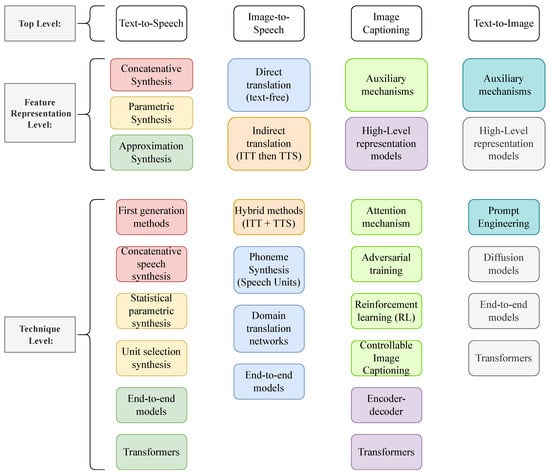 Proposed taxonomy of reviewed techniques operating with text, sound, and vision data. On the top level, we divide the methods based on the produced input–output data pairs, and then in the middle (feature) level, we divide each group into representation-level sub-groups. Finally, we collect and list commonly used techniques in each sub-group, including typically used models, architectures, and mechanisms at the bottom (technique) level. We use the same color annotations in the middle and bottom levels to annotate which techniques at the bottom belong to which mid-level feature representation sub-group.