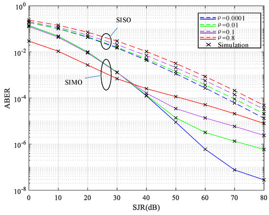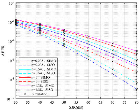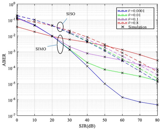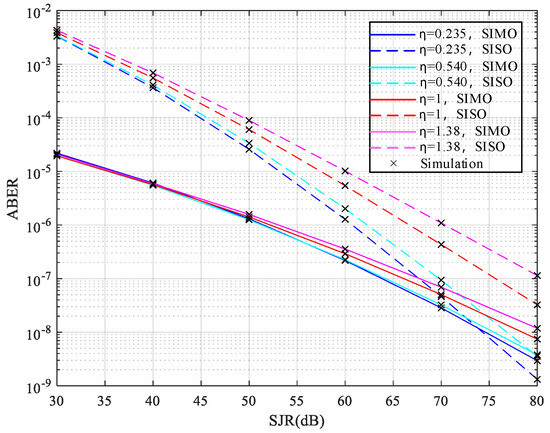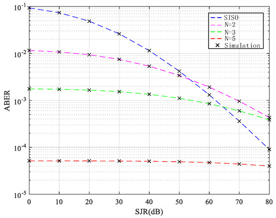 When , , , , , , Figure 2 illustrates the variation of ABER with SJR obtained by (21), and Monte Carlo simulation at . It can be observed from Figure 2 that the concordance between the analytical and simulation plots validates the accuracy of the derived expression. It can be observed from Figure 2 that as the receiving aperture N increases, the ABER shows significant improvement. However, with the increase of SJR, the degree of improvement decreases. This is because the jamming signal only jams one of the receiving apertures, and under high SJR, each receiving aperture can effectively receive signals. Since the additive white Gaussian noise is not considered in Figure 2, when SJR is high, increasing the number of receiving apertures cannot significantly improve the ABER when the SJR is large. When N = 5, the improvement of ABER with SJR increasing is not very obvious. The reason is that increasing the number of receiving apertures can effectively suppress the influence of jamming. At the same time, even though the additive Gaussian white noise is not considered, the FSO system are also affected by path loss, PE, and AT, which are a static variable, so the changing trend of ABER with SJR is not obvious.