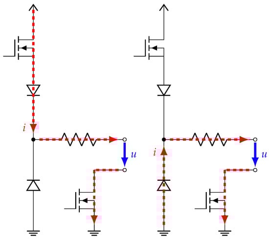The MOSFET controls the current flow i, while the MOSFET , on the other hand, is always in the on-state in the application being used here. However, must be considered in the following simulation. One section runs from time , where is turned on while , and while , blocks the current flow from the power supply. By using current clamp A and a differential probe V connected to an oscilloscope, current i and voltage u can be measured from P to N.