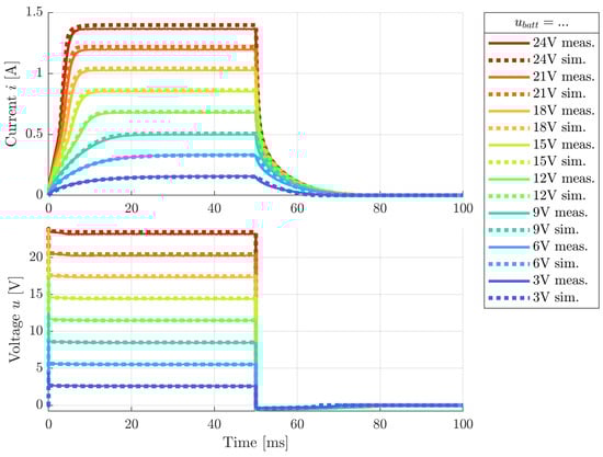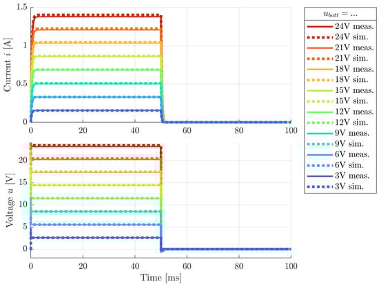 is increased from 3 V to 24 V in steps of 3 V. The comparison between the measured and simulated results in current