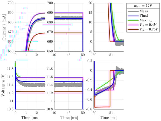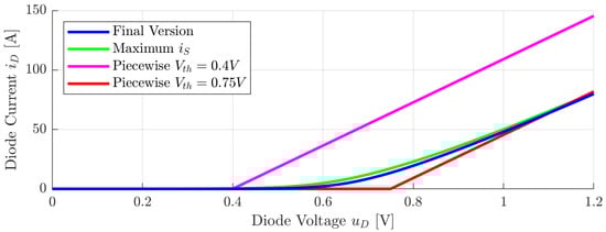 n, all other values can be extracted directly from the datasheet. The emission coefficient is then chosen such that the resulting diode characteristic curve matches the curves from the datasheet. The datasheet provides a maximum value for the saturation current. Therefore, in addition to the maximum value, a reduced value was also tested. The latter provides a better approximation of the characteristics, as well as a better agreement between the simulation results and the measurement results. Hence, the reduced value of
