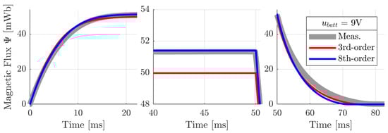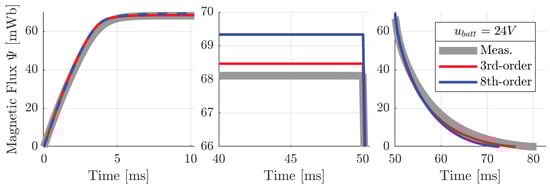 In summary, an electric system for controlling inductances was modeled as a circuit simulation. To accomplish this, the system was initially loaded with a constant inductance to avoid nonlinear effects from conductive, ferromagnetic materials, while neglecting motion induction. As a result, the nonlinear effects of the semiconductor components could be more easily examined and modeled with greater precision. During this process, the simulation results were compared with measurements, and parameters were adjusted accordingly. Once the semiconductor components were accurately modeled, the constant inductance was replaced by a nonlinear, hysteresis-dependent inductance. By gradually increasing the voltage, multiple flux characteristics were recorded, and through interpolation using polynomial approximations of various orders, nonlinear functions for the magnetic flux was determined. These polynomial functions, which are nonlinear but independent of hysteresis, are intended to approximate the measured flux characteristics dependent on hysteresis.