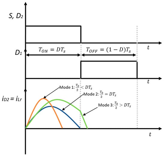 The three operation modes are presented in Figure 3. The operation mode is determined by the transistor on time with respect to the resonant period T0. In modes 1 and 2, the switching losses are low because the resonant current iLr naturally reaches zero, assuring zero current switching for diode D2. Mode 3 is to be avoided because the resonant current is nonzero at the time the transistor is switched off.
