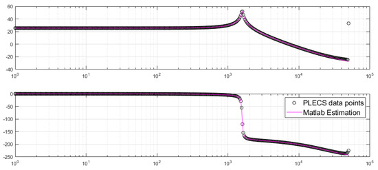 It can be remarked that the transfer function contains a zero in the right half plane, similar to the classical boost topology. In Figure 6, both the PLECS data points and the estimated second-order transfer function are represented. It can be remarked that excellent overlapping is achieved.