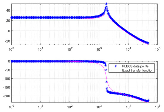 The algorithm in [23,24] for deriving the exact control-to-output transfer function is implemented in MATLAB. Similar to (3), the algorithm provides a complex number for each frequency value in the frequency vector. Figure 7 compares the Bode data obtained from PLECS (blue dots) to the exact transfer function values (magenta line). A good agreement can be remarked except for the zone around the resonant frequency where PLECS is predicting a higher quality factor. Anyway, the cutoff frequency will be chosen much higher than the resonant frequency, and therefore, this mismatch is not affecting the design.