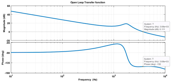 The open-loop transfer function is depicted in Figure 9. It can be seen that a cutoff frequency, fC, of 3.7 kHz and a phase margin φm of 28° are achieved.