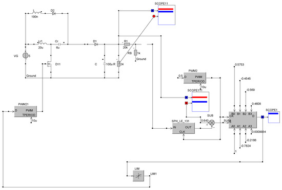 In order to validate the digital controller, the converter was simulated in a closed loop. The simulation program used for this purpose is CASPOC [28]. The simulation schematic is presented in Figure 10.