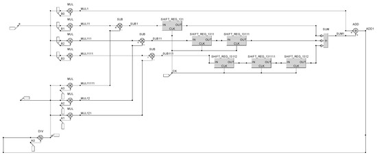 The output voltage is first scaled by a voltage divider and then passed to a sample and hold block that performs sampling on the leading edge of the clock signal. This block emulates the analog to digital converter input that will be used in practice for monitoring the output voltage by the digital signal processor. The output of the sample and hold block is subtracted from the reference voltage and the error signal is passed through the digital controller. The direct form II [27] is used to implement the digital controller using minimum number of shift registers, as can be seen in Figure 11.