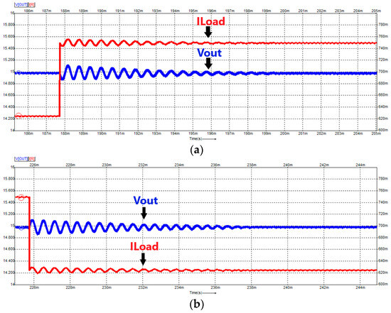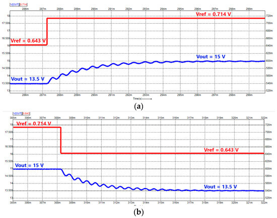 Figure 12 depicts the closed-loop response of the converter to a load step from 24 Ω to 15 Ω (Figure 12a) and from 15 Ω to 24 Ω (Figure 12b). This implies load current steps from 626 mA (corresponding to 24 Ω) to 751 mA (corresponding to 15 Ω). The output voltage is represented on the left Y-axis in [V], whereas the load current is represented on the right Y-axis in [mA]. In both plots, the output voltage is regulated to 15 V after the transient, as desired. Figure 13 shows the closed-loop response of the converter to a step change in the reference voltage. The output voltage is represented on the left Y-axis in [V], and the reference voltage is represented on the right Y-axis in [mV]. Figure 13a depicts the output voltage before and after a step change in the reference voltage from 0.643 V to 0.714 V, whereas Figure 13b presents the output voltage change to a step in the reference voltage from 0.714 V to 0.643 V. In both cases, the output voltage changes to the desired setpoint from 13.5 V to 15 V (Figure 13a) and then back from 15 V to 13.5 V (Figure 13b).