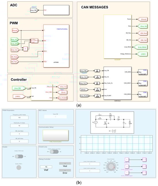 For rapid prototyping, the code was implemented using Simulink Support Packages for C2000 Devices [29]. Figure 15a depicts the Simulink blocks used to generate the code. Four main software modules are addressed: the ADC module, the PWM module, the digital controller module and the controller area network (CAN) communication module. Figure 15b enfaces the graphical user interface (GUI). The CAN messages are sent between the GUI and the DSP such that the user can easily visualize and modify converter parameters. A switch is used to change between open- and closed-loop modes of operation.