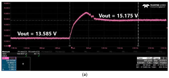 For the case in Figure 17a, the output voltage of the converter changes from 13.585 V to 15.175 V for a step in the reference voltage from 0.643 V to 0.714 V. An overshoot of 46.1% and a rise time of 159.9 µs are measured. For the case presented in Figure 17b, the output voltage changes from 13.585 V to 15.175 V for a step in the reference voltage from 0.714 V to 0.643 V. The overshoot is 9.3%, the undershoot is 37.6%, and the fall time is 135.4 µs. It can be concluded that the closed-loop system has a robust response which confirms the controller design.