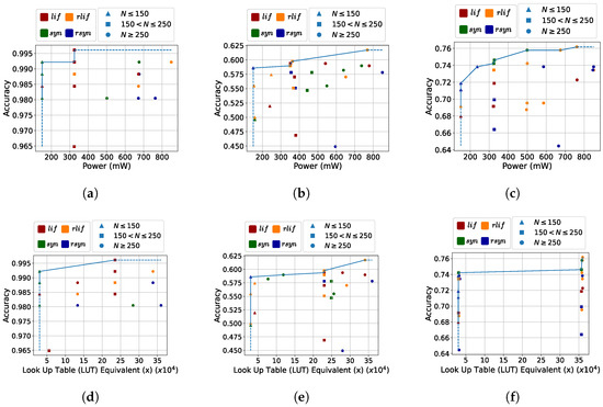Figure 4 summarizes the performance of SpikeExplorer when optimizing the network architecture and parameters for the three selected datasets. The figure demonstrates a strong correlation between power consumption (the first row in Figure 4) and area (the second row in Figure 4). While this behavior is expected, it is noteworthy because previous publications predominantly emphasized the correlation between power consumption and spiking activity [33]. For the MNIST dataset (refer to Figure 4a,d, nonrecurrent models emerge as the preferred choice. This preference is evident from the Pareto frontier, where virtually all top-performing models are lif and syn without recurrence. Notably, the highest accuracy is achieved with a first-order LIF model, devoid of any feedback connection (refer to Table 3). This is consistent with expectations since simple architectures without explicit recurrent connections should be enough, given the static nature of MNIST data transformed into spike sequences via rate coding. In this scenario, crucial information is not embedded in the temporal dimension but encoded in the average spike sequence rate. Consistently with what is expected, SpikeExplorer converges towards these more straightforward solutions. Conversely, in the case of SHD and DVS128, acquired through biologically inspired sensors and containing substantial information in spike timing, SpikeExplorer generally leans towards recurrent structures such as rlif and rsyn, along with higher-order models (syn). Specifically, for SHD, a recurrent structure comprising rlif neurons emerges as the favored solution. At the same time, the search tends to diversify more toward both rsyn and rlif, occasionally incorporating syn instances for the DVS128. It is noteworthy to observe how SpikeExplorer can discover superior architectures in terms of accuracy by utilizing the same neuron model and comparable numbers of neurons while playing on other parameters, allowing us to keep the power consumption unchanged while better tuning them on the target task. This is visible when looking at the left section of the Pareto frontier across all three datasets.