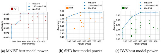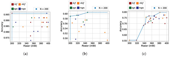 Pareto frontiers of the exploration with the number of neurons constrained to 200 for each benchmark. (a) MNIST fixed number of neurons power; (b) SHD fixed number of neurons power; (c) DVS fixed number of neurons power.