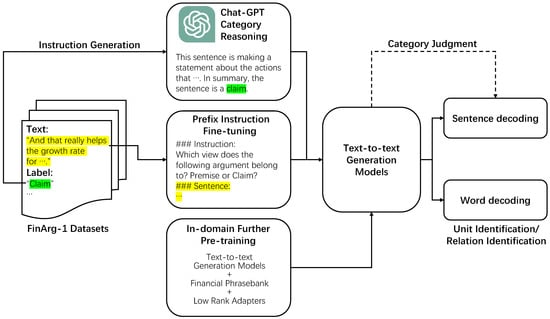 As one of the pioneering LLMs, T5 [] is an encoder–decoder text generation model pre-trained on a multi-task mixture of unsupervised and supervised tasks converted into a text-to-text format. It offers a unified framework for the realm of NLP pre-trained models by unifying diverse tasks into a single format. Subsequent research such as [,] explored the limits of text-to-text generative models applying to Aspect-Based Sentiment Analysis (ABSA) tasks. Jordan et al. [] introduced a Chatbot Interaction with the AI framework in which T5 plays a pivotal role in data augmentation. Similarly, a study by [] explored a framework for fact verification. This framework harnesses pre-trained sequence-to-sequence transformer models and employs T5 in a listwise method, paired with data augmentation techniques. To the best of our knowledge, no work has been performed to date on financial argument analysis with text generation LLMs. This paper mainly focuses on providing an in-depth look at the recent trend—fine-grained financial argument analysis integrated with large language models—-and focuses on the robustness and interpretability of the model.