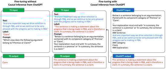 Subsequently, the “Explanation” generated by ChatGPT is harnessed as the target text for the fine-tuning process of the T5 model as shown in Figure 1. As mentioned in Section 3.1, when the reasoning of ChatGPT is used as the label, we aim to align the instruction during the T5 fine-tuning with the prompt that was initially utilized by ChatGPT to gain the same knowledge and logical reasoning. Specifically, the prompts are shown in “Long Instruction for AUI (train with ChatGPT Causal Inference)” and “ChatGPT Causal Inference prompt” in Table 2. In this process, ChatGPT is regarded as a “teacher” model, guiding the T5 model to output in the form of causal reasoning, making the model’s decisions somewhat interpretable. An example of the difference between using Causal Inference from ChatGPT or not is shown in Figure 2. Causal Inference from ChatGPT enables the T5 model to simultaneously output text labels and inferences. When evaluating model performance, we use the last word of the T5 model inference text as the output label.