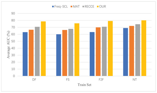 As shown in Table 4, our method achieves higher average AUC on the four forgery subsets when trained on datasets containing only one type of forgery method, compared to the comparative methods. Also, in most individual comparisons, it performed better than the comparative methods. Notably, models trained on DF and NT and tested on FS and F2F showed results below RECCE. We speculate that the possible reason is that FS and F2F are forgeries based on computer graphics, and RECCE’s learning approach based on reconstruction networks and identity features may better generalize to these two forgery methods. Figure 5 presents the average AUC results of training on one forgery method and testing on the remaining three forgery methods. Overall, the method proposed in this chapter demonstrates good generalization ability in dealing with unseen forgery types.