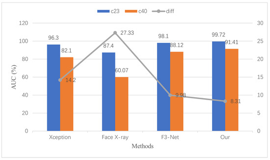 Evaluations were conducted within the datasets using two qualities (HQ and LQ) of FF++ and the Celeb-DF dataset. As shown in Table 2 and Table 3, our method demonstrated superior performance on both datasets. Specifically, on the FF++ dataset, compared to methods based on local relations, such as LRL and MRL, our method increased the average AUC by 1.26% and 1.37% for the two different compression ratios, respectively. Moreover, the proposed scheme also showed significant improvements over methods based on frequency features, such as -Net, SPSL, and Freq-SCL, as well as the attention-based method MAT. Experimental results on the Celeb-DF dataset were also superior to all comparison schemes. Therefore, the in-dataset experimental results demonstrate the effectiveness of our proposed detection method.
