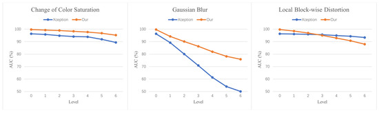 In addition to excellent generalization over unknown data, it is essential for detectors to withstand the common damages that videos may experience on social media. We examined the effect of degrees of H.264 video compression on detector performance by training the detector with FF++ c23 (i.e., HQ version) and subsequently testing it at video compression rates c23 and c40. Figure 6 illustrates that although Face X-ray exhibits strong generalization capabilities, it is highly sensitive to compression, suggesting that hybrid boundaries are vulnerable. The -Net delivered results that were slightly below ours but demonstrated significant enhancement over two comparative methods, indicating that incorporating frequency information effectively alleviates compression effects. Moreover, we evaluated our method against the Xception backbone by measuring the AUC at six distinct levels of three specific image perturbations: color saturation changes, Gaussian blur, and block-wise distortion, following the settings outlined in reference [49]. As depicted in Figure 7, our method showed superior robustness to the backbone network, particularly under Gaussian blur scenarios where Xception nearly failed as interference intensified, whereas our method remained effective. This advantage stems from our method’s reliance on detecting block-level correlations rather than visual features. However, this also resulted in weaker robustness of our method under block-wise distortion compared to the backbone. It is crucial to note that in practical scenarios, such block damage is significantly less frequent than the other two perturbations, thus maintaining our method’s considerable benefits.