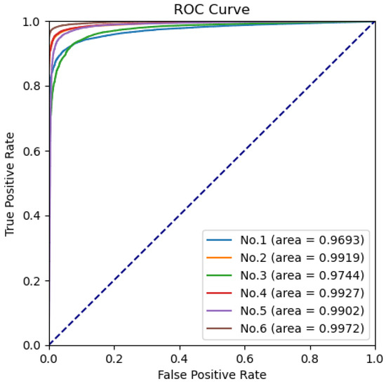 As shown in Table 6, by comparing the results of Experiment No.1 and Experiment No.2, it can be seen that when only the baseline model BASE is used, the accuracy and AUC of the model are 95.25% and 96.93%, respectively. However, when the ReLAM module is introduced on top of BASE, the accuracy and AUC of the model increase to 96.61% and 99.19%, respectively, proving the significant improvement of the ReLAM module on the overall performance of the model. Similarly, by comparing the results of Experiment No.3 and Experiment No.4, the effectiveness of the ReLAM module is also confirmed on the frequency domain branch. Furthermore, by comparing the results of Experiments No.1, No.3, No.5, and Experiments No.2, No.4, No.6, it is found that under the same configuration, the performance of the dual-branch structure model surpasses that of the single-branch model. Finally, when all modules (BASE, ALFEM, DCFFM, and ReLAM) are combined, the model’s accuracy and AUC reach the highest at 97.92% and 99.72%, respectively, fully proving that the combination of these four modules can achieve the best model performance. The comparison results of the ROC curves for different component models are shown in Figure 8.