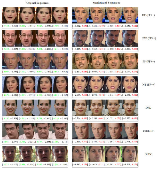 To demonstrate the actual detection efficacy of our model on input face images, we selected several face sequences from the test sets of FF++, DFD, Celeb-DF, and DFDC, and recorded the prediction scores from the final binary classification feed-forward layer of the model. In this system, a real face is labeled as 0, while a fake face is labeled as 1. As illustrated in Figure 9, the classifier’s output distinctly differentiates between real and fake faces in the FF++ and DFD datasets. Although the score discrepancy is reduced for the Celeb-DF and DFDC samples, the classifier still effectively decides the authenticity of the video.