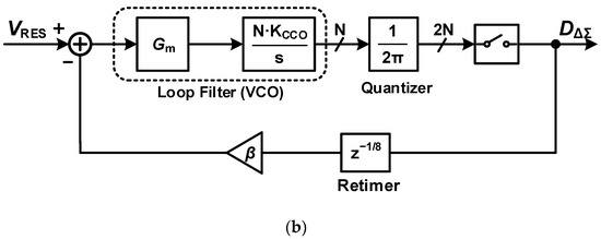 - Li, S.; Mukherjee, A.; Sun, N. A 174.3-dB FoM VCO-Based CT ΔΣ Modulator with a Fully-Digital Phase Extended Quantizer and Tri-Level Resistor DAC in 130-nm CMOS. IEEE J. Solid-State Circuits 2017, 52, 1940–1952. [Google Scholar] [CrossRef]