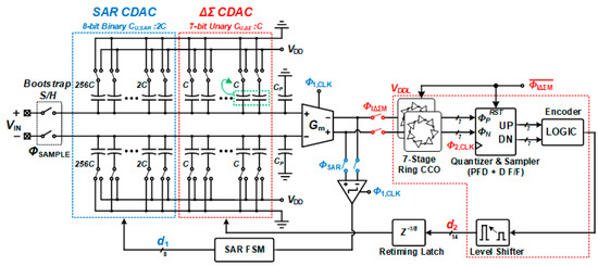 - Hsieh, S.-E.; Hsieh, C.-C. A 0.4-V 13-bit 270-kS/s SAR-ISDM ADC With Opamp-Less Time-Domain Integrator. IEEE J. Solid-State Circuits 2019, 54, 1648–1656. [Google Scholar] [CrossRef]