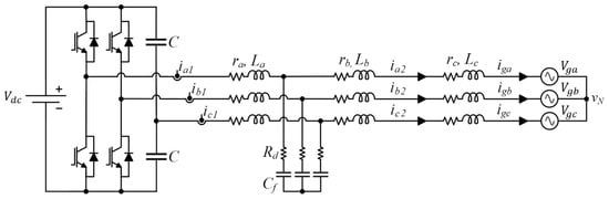 In Figure 1, the B4 inverter is connected to the grid via an LCL filter, formed by {ra, La}, {rb, Lb}, and {rd, Cf}. The {rc, Lc} set represents the grid impedance. Although three current sensors are depicted in Figure 1, they are not necessary. Two sensors would suffice, as the sum of the currents in each line is 0. The same principle applies to the voltage sensors shown in later figures.