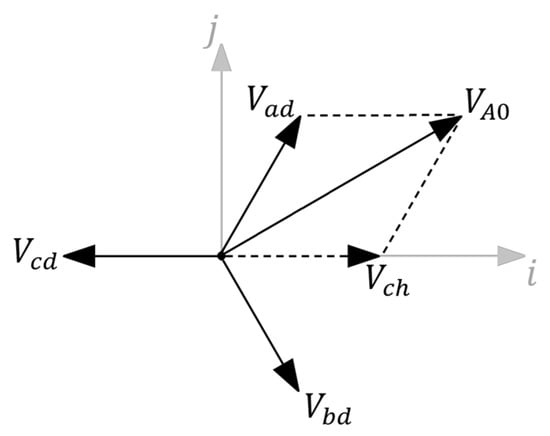 In Equations (1)–(3), Vad, Vbd, and Vcd are the positive sequence voltages, while Vah, Vbh, Vch are the zero sequence voltages of phases A, B, and C, respectively. Considering that the homopolar phasors have the same magnitude, Equation (1) can be rewritten as: