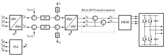 One of the usual control strategies for B6 grid-connected inverters is to carry out the control in a rotating synchronous reference frame, also known as ‘DQ control’, allowing independent control of the direct (D) and quadrature (Q) components of the current, as shown in Figure 6.