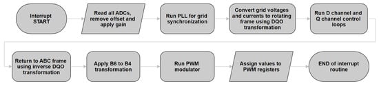 After the two PI controllers are executed and the signals have been converted back to the abc frame, Equations (7) and (8) are applied, obtaining and . These signals are sent to the PWM modulator, obtaining the four gate signals. As shown in Figure 6 and Figure 7, the control is carried out in a rotating frame which is in sync with the grid. Therefore, grid synchronisation is mandatory.