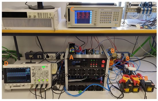 Experimental setup: (A) inverter; (B) LCL filter; (C) power analyser; and (D) oscilloscope.