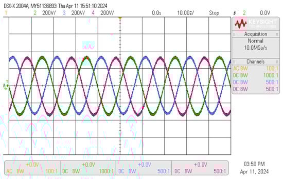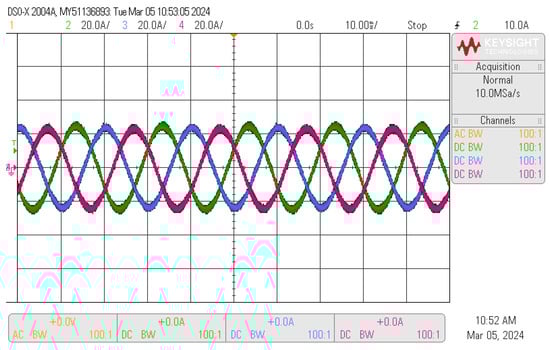 Figure 13 shows the output current of the inverter. In all the following figures, the green trace represents line A current, the blue trace represents line B current, and the pink trace represents line C current (the one obtained from the midpoint of the capacitor bank).