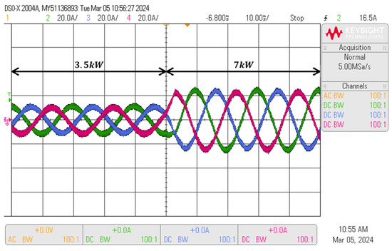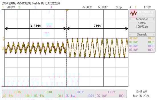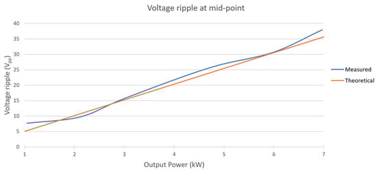 As it may be seen in Figure 15, the output current remains sinusoidal independently of the output power and the voltage ripple. The total harmonic distortion increases to 1.8% at 7 kW. Figure 16 displays the measured voltage ripple at the midpoint of the capacitor bank, alongside the corresponding theoretical values across various power levels.