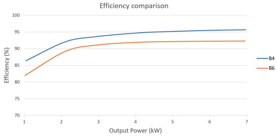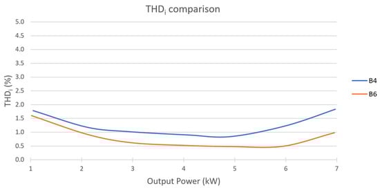 Figure 20 shows the measured THDI of the grid currents for both tests. Both topologies have a similar THDI in the low-power range. In the high-power range, the B6 topology has a lower distortion than the B4 topology. Specifically, the THDI at the corresponding rated power of each topology is 0.98% for B6 and 1.83% for B4.