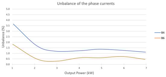 Furthermore, although harmonic distortion is similar in both, B6 has a lower THD. The difference is more significant at high loads, where in B4 it reaches a 1.83% while in B6 it remains at 0.98%. Current harmonics 3 to 7 are the predominant in both topologies. Similar trends are observed with the current unbalance, with B6 exhibiting a slightly lower level. At high loads, the current unbalance in B6 reaches 0.4%, whereas in B4 it stabilises at 1.1%.